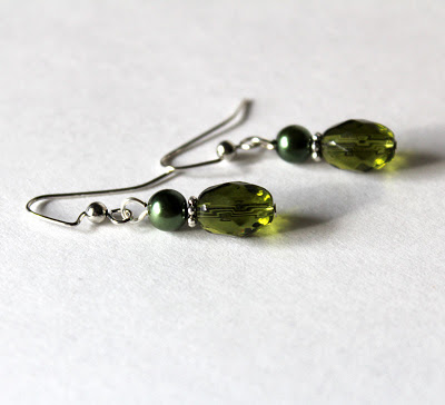 A pair of earrings, made with moss green glass pearls, peridot colored glass, and nickel-free silver plated findings. Like them? Want them? Leave a comment here to enter, and if you’ve liked my Facebook page, mention it for a second entry into the drawing! But please remember, this month’s contest is only open to residents of the United States.