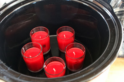 Once the wax is all melted and your candles are the depth you want them, turn off the crock pot and carefully drop the wicks into the middle of the melted wax. Let cool.