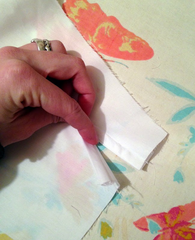 This step was very difficult to photograph since I needed both hands to hold the fabric and iron. Fold the lower lap (The small side) to the wrong side, covering the raw edge. Press.