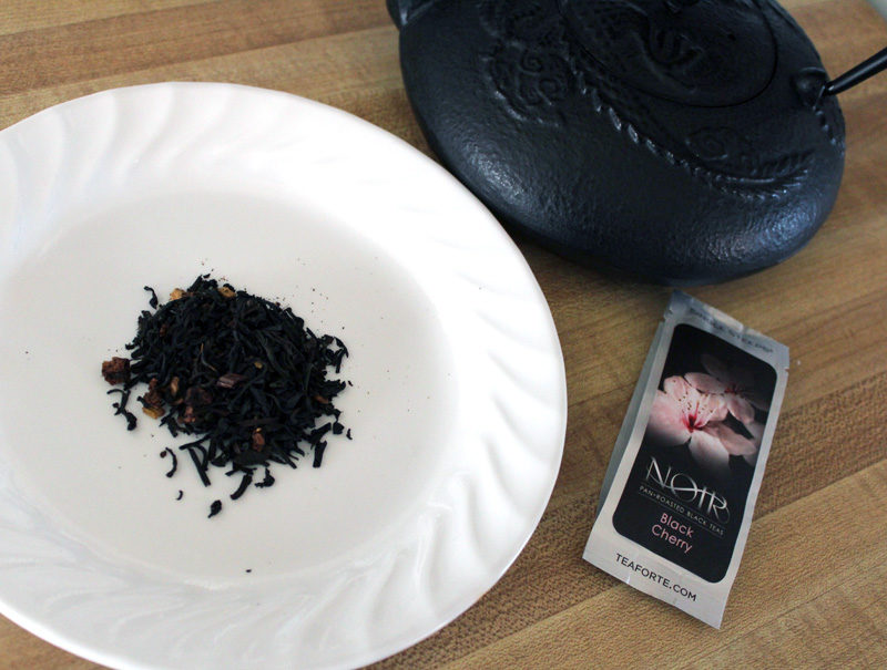 One of the teas sent along was Tea Forte’s Black Cherry Noir in a single-steep packet, perfect for a quick afternoon pot of tea. Not only did it sound delicious, the packaging was incredibly aesthetically pleasing. Seriously, I wish my house could look like this packaging. Or maybe it kind of does? The desk where I spend most of my day is a sleek black and silver, and I’ve got pink accents and cherry blossoms all over the place. Either way, it looked good.