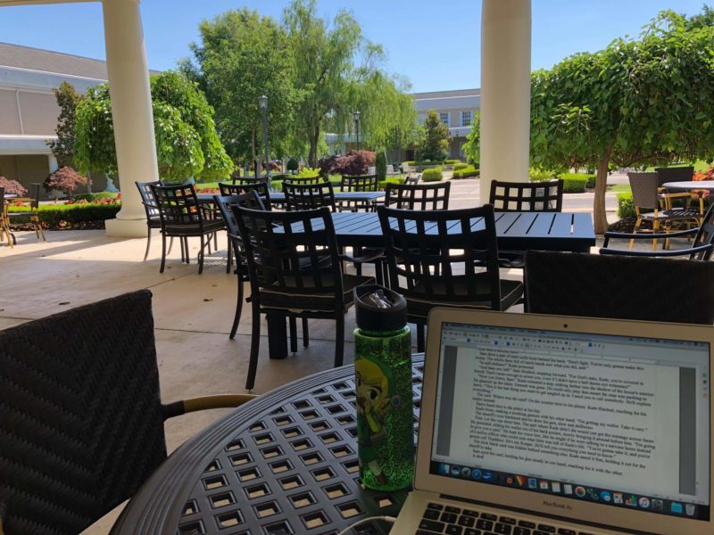 Before I could do anything, I needed to reread everything I’d written so far. I haven’t touched this story in a few months, so I need the refresher. I got caught up editing a little along the way, but it didn’t take too long, as I was just shy of 12,000 words into the story. After I was done reading and knew where I was starting from, I copied my outline paragraph for that chapter over to the story document and started work at around 10. I brought headphones to shut out the sound of the sports the hundreds of kids here were doing, so I was in my quiet little bubble on the other side of the garden. It’s beautiful, so it’s hard not to be inspired there.
