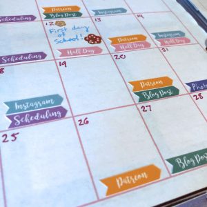 I saw some schedule stickers in colors I loved when I was out shopping, but they were for teachers, so the labels didn’t make sense for me. I made my own when I got home. I feel like I do better when I have everything on my calendar. I broke mine down to social media platforms, too, since I use a lot of different ones, but I made a set of flags specifically for other authors, too.