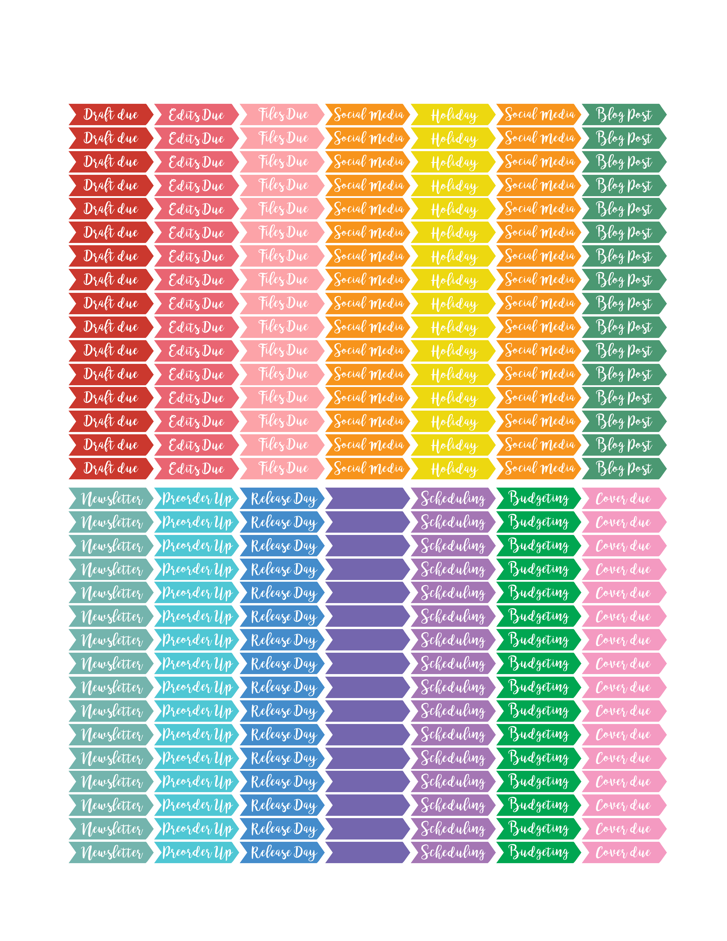 Here’s the free printable set I made for authors. The stickers are an inch wide and a quarter inch tall, so they fit into tiny planners, too. There’s a blank column so you can pencil in specific needs as they crop up. I like using a white gel pen, just so the colors match.