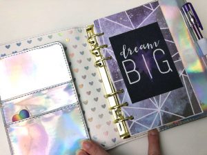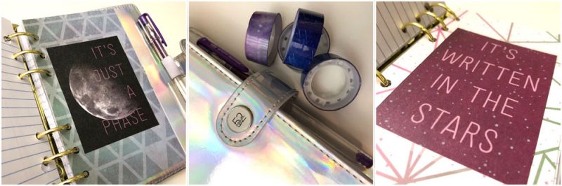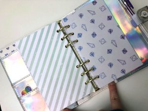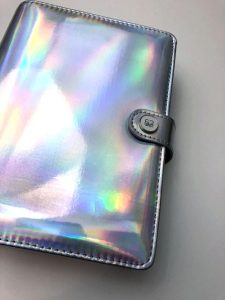I set up some dividers inside using scrapbooking paper my parents gave me for Christmas that I wanted to use, but didn’t know how to utilize. The prismatic color schemes and designs work perfectly with the shimmering holographic cover. I’ve got some pretty washi tape set aside to add color pops, and I’ll be designing some series-specific stickers for a little extra fun, but right now, I’m focusing on how to use this to help my writing.
