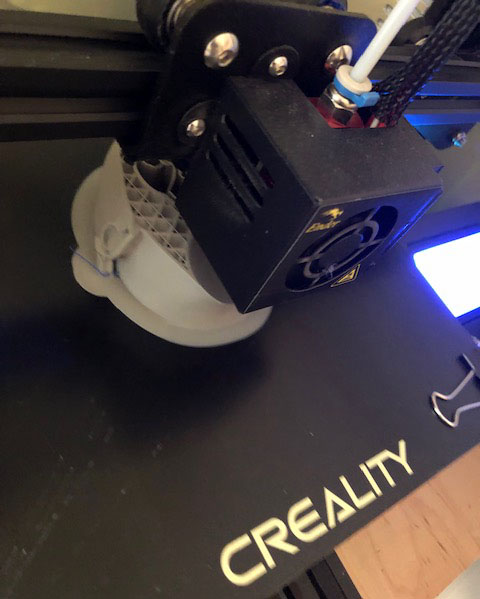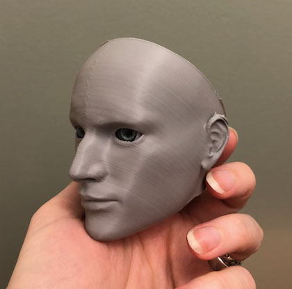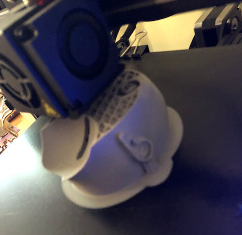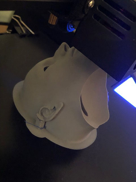 The print didn’t turn out perfectly, since it was a stormy day, and a couple power flickers messed with the heat of the nozzle, which meant a few extra-rough lines. The tree supports for his ears also didn’t adhere to the print bed well, so the tops of his ears turned out poorly. There were some user issues, too, such as me being a little too eager to start the print, and forgetting to rotate it so the Z seam would be on the back of the head. As a result, he’s got a pretty clear seam line running straight down the middle of his face.