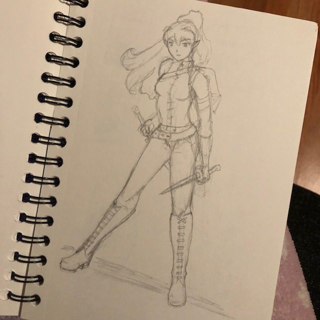 Perhaps to be expected, but Lark ultimately has been the hardest to nail down as far as appearance and design goes. I gave her a high-collared but sleeveless shirt, which I planned to use to show a bit of muscle definition in her arms and make it clear she was someone who could hold her own, despite her regal and refined–and somewhat aloof–personality. Originally, I had some concerns that her physical appearance would be too similar to that of Tula, since they both have high ponytails. In color, they’re easy to tell apart, but I think Lark is a little more fine-featured than Tula is, so I think it’s easy enough to distinguish them in the black and white sketches. This one might be fun to paint at some point. Maybe I’ll finish it someday, but I don’t know.