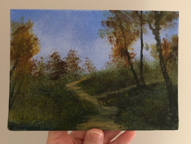 I’ve always enjoyed making up little landscapes, and that proved perfect for the tiny canvas boards I’d picked up at the dollar store. Most of my paintings were 5×7 and 4×6, and trying out a few tiny landscapes was a lot of fun because it was just a tiny space, a little spot in the woods or something similar, rather than the sprawling valleys and mountain ranges I’d done before after watching Bob Ross for too many hours.