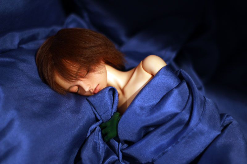 A child version of Rune. He’s a hybrid of a Fairyland Minifee Seorin and a Soom Little Gem Ralis fantasy body, although he has the human parts too. His forearms and lizard hands were sculpted by me. The body came in NS and has been dyed tan. The heads were airbrushed to match. He has both a sleeping head and an open-eyed head. The sleeping head is NS resin and the open-eyed head is white resin, although it’s from around 2008 and has yellowed significantly.
