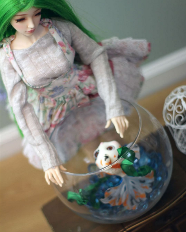 She was purchased directly from Iplehouse and I am her first owner. She was ordered with normal thigh pieces and a large bust piece. She’s particularly fun to sew for, as her wardrobe tends to be bright and fun.